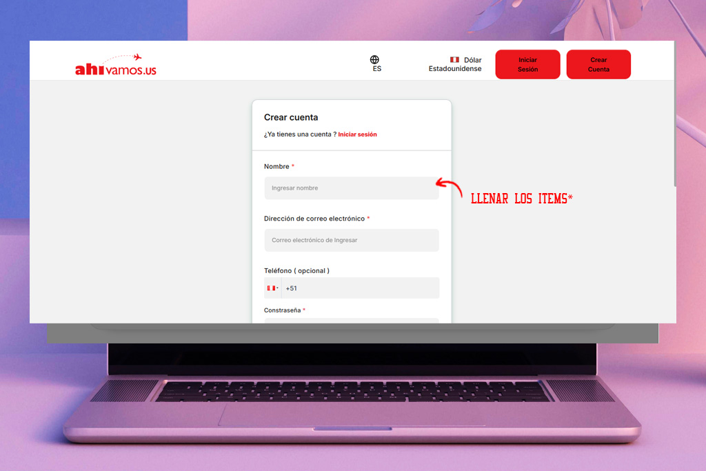 tendrás que llenar los puntos que se indican, Nombre*, dirección de correo*, teléfonos* y por ultimo crearas la contraseñas* y le darás clic en el botón crear cuenta.